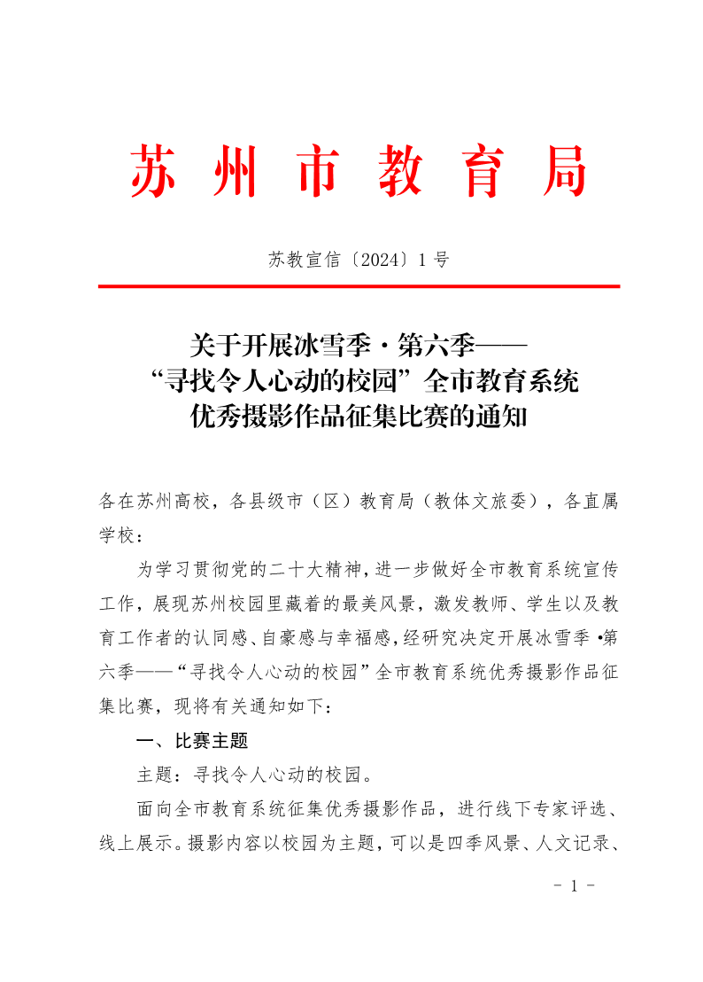 (转发)苏教宣信〔2024〕1 号关于开展冰雪季·第六季——“寻找令人心动的校园”全市教育系统优秀摄影作品征集比赛的通知 来源: 发布时间:2024-01-12 15:12:39 浏览次数: 次 【字体:小 大】 分享到: 【打印正文】